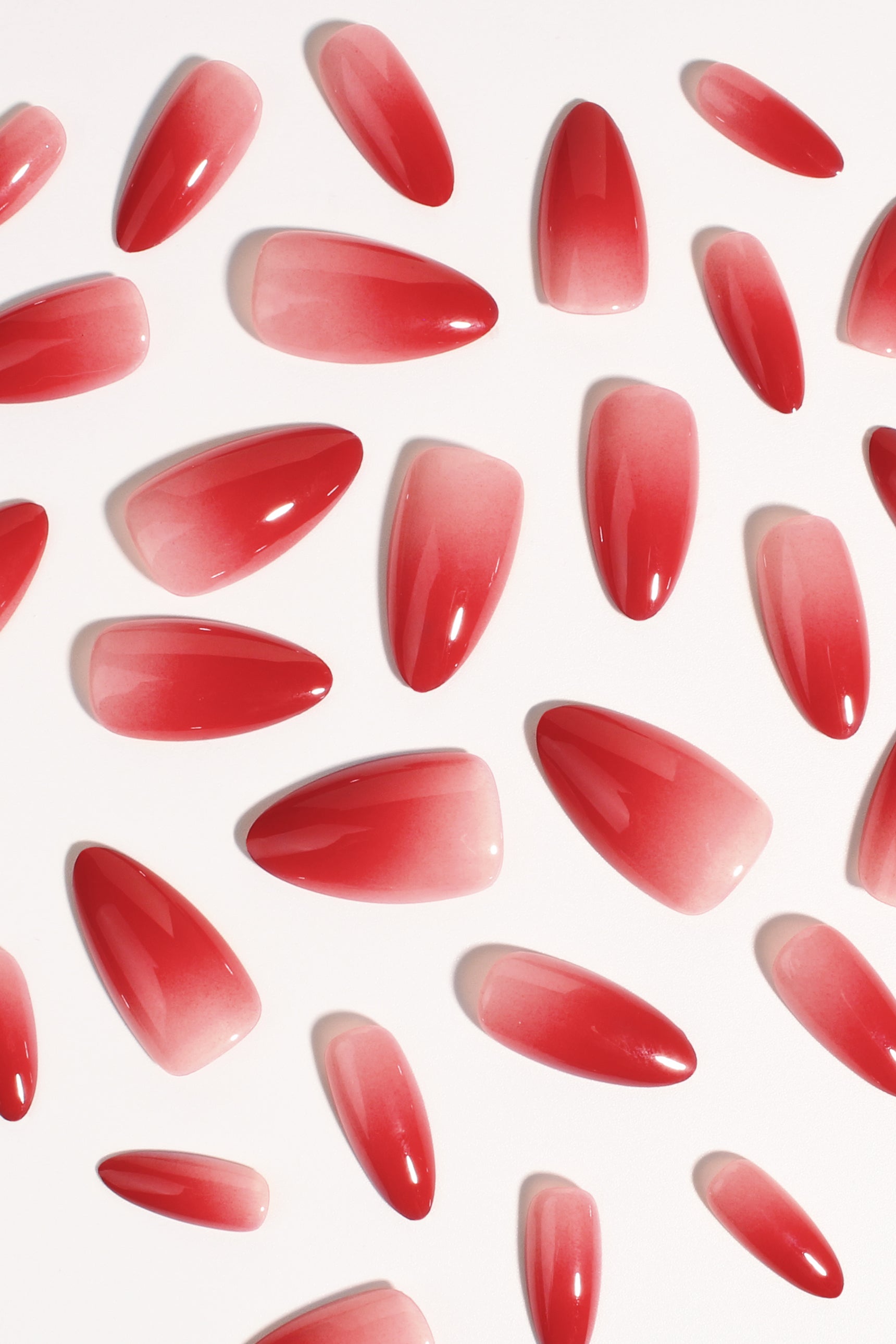 Spark elegance with the Bonfire press-on nail kit. The ombre effect on each nail is a spectrum of fire, from vibrant, hot red to a warm, subtle glow, reminiscent of flames that charm with their timeless dance. Perfect for any occasion that calls for a touch of warmth and radiance, these nails are your go-to for an expressive, fiery statement that's always in style.