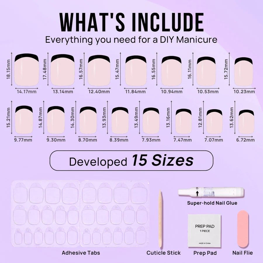- Includes 30 tip nails, nail glue, nail file, alcohol pad, adhesive tabs,and nail removing/cuticle pusher tool