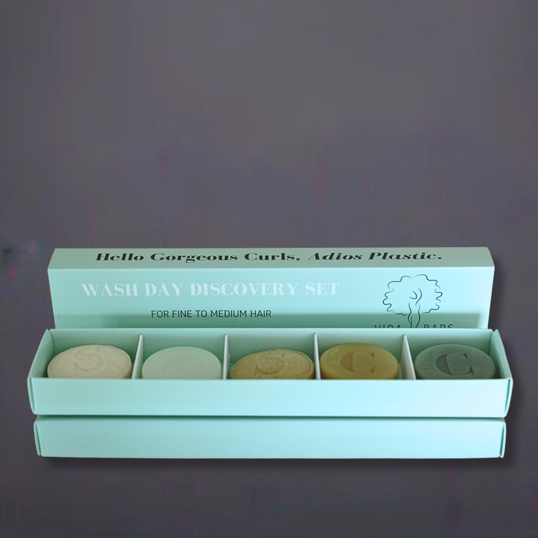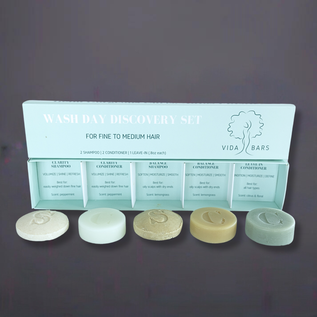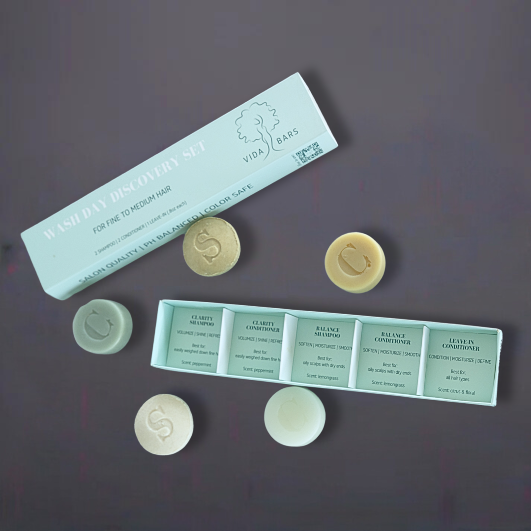 We’ve carefully selected individual ingredients for each Vida Bar to provide specific benefits to your hair. Our Discovery Set for Fine to Medium hair includes our Clarity, Balance and Leave-in conditioner bars, each with unique formulas providing lightweight moisture. Find a full list of ingredients below. Worry free care for your tresses, free of sulfates, silicones, drying alcohols, parabens or harsh chemicals.