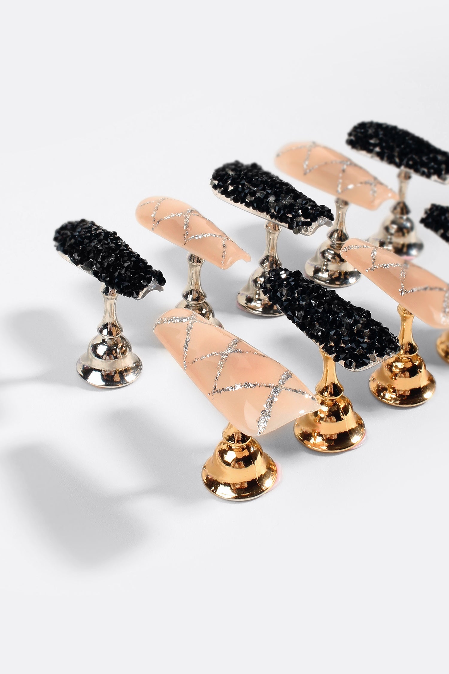 Odette's Opulence is a symphony of balletic grace and luxurious detailing, designed to elevate the artistry of your hands. The long coffin shape of each nail is a nod to the modern yet timeless beauty, offering a canvas that enhances the hand’s natural grace. The nude base of the nails is reminiscent of the soft hue of ballet slippers, made radiant with slender lines of gold glitter that trace a path across each tip, much like the golden threads in a costume of the finest ballet. These lines of shimmering gold intersect with the depth of the black accents and the sparkle of delicate gemstones, creating a striking contrast that captures the dual nature of Odette and her shadow, the Black Swan. Embrace the elegance of classical dance with Odette's Opulence, where every gesture of your hands tells a story of sophistication and grandeur.